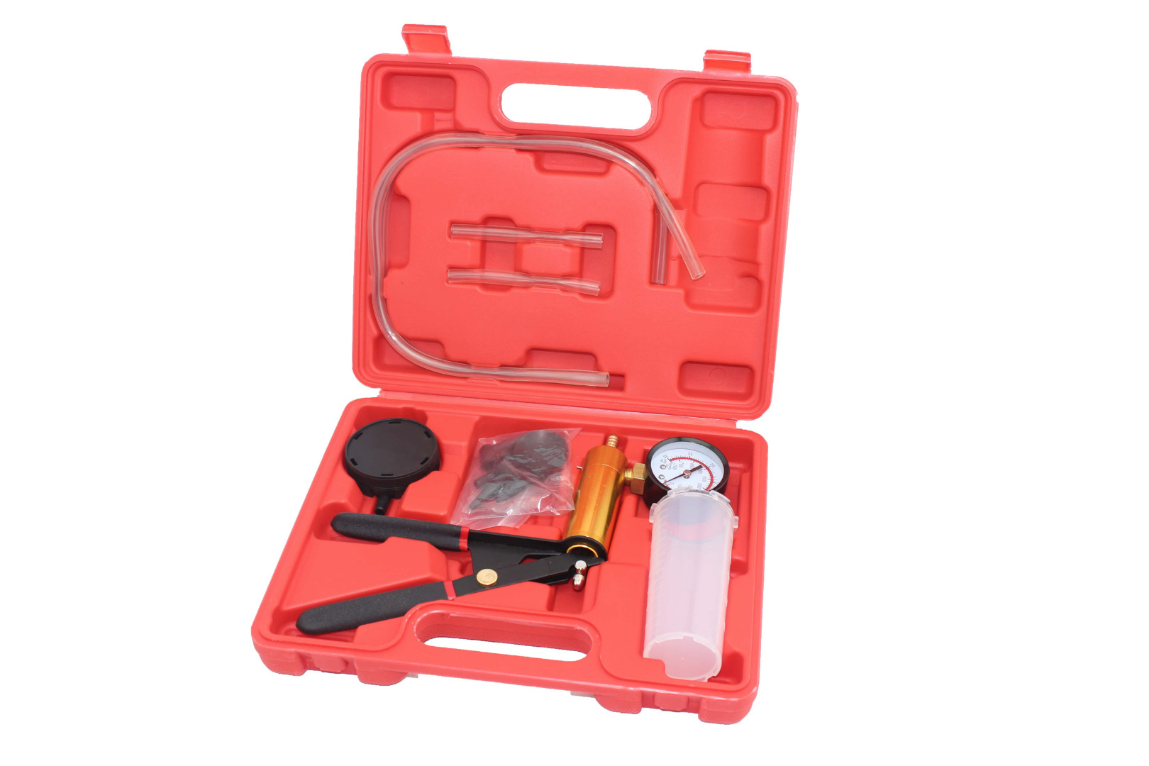 Вакуумный насос, 2шт шланга длиной 80см, 8шт адаптеров, пластиковый стакан для тормозной жидкости.