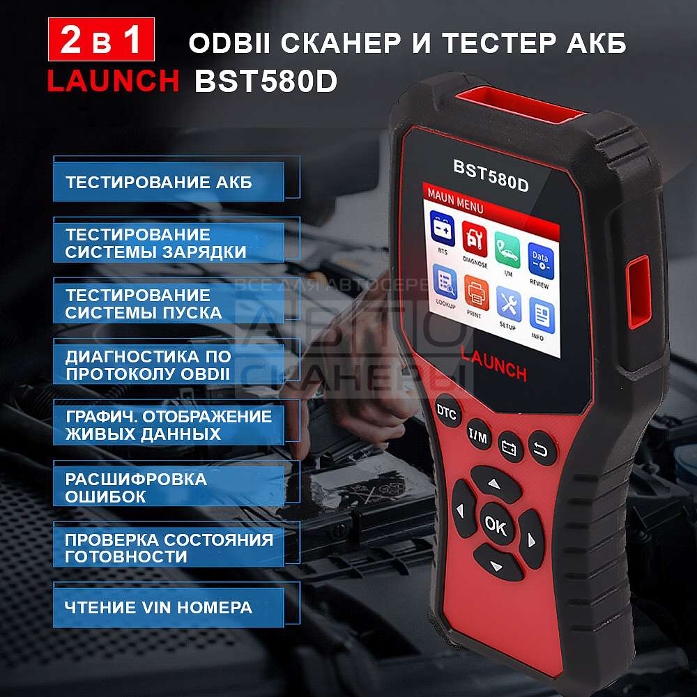 Launch BST 580D - это многофункциональный тестер 2в1. С его помощью вы протестируете практически любые аккумуляторные батареи с напряжением 12В, проверите системы пуска и зарядки, а также продиагностируете любой автомобиль поддерживающий протокол OBDII. Меню тестера поддерживает русский язык. Результаты тестирования сохраняются в памяти тестера с возможностью распечатки.