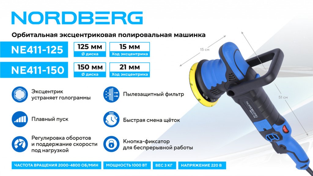 Орбитальная полировальная машинка NORDBERG NE411-150 – электрический инструмент для выполнения профессиональных работ в автосервисах, студиях детейлинга и других предприятиях, занимающихся покраской.