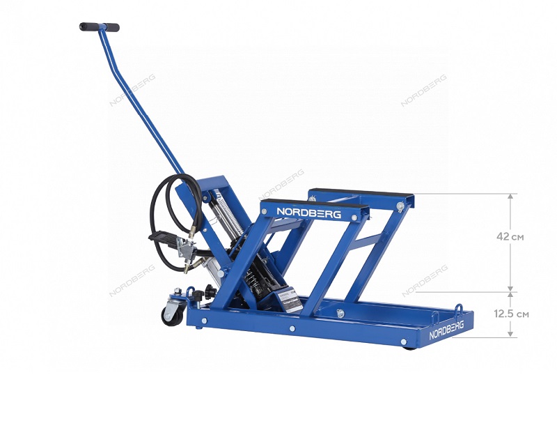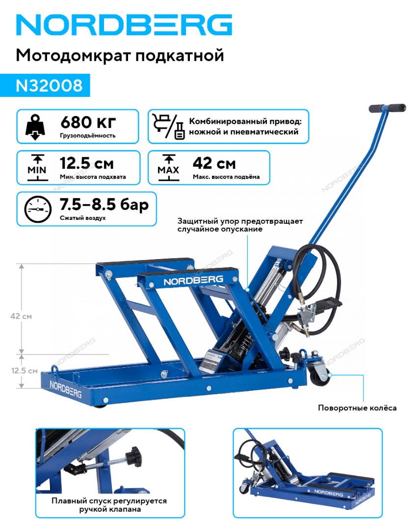 NORDBERG N32008 — профессиональный подкатной мотодомкрат для проведения технического обслуживания и ремонта. Применяется в мотомастерских, автосервисах и гаражах.