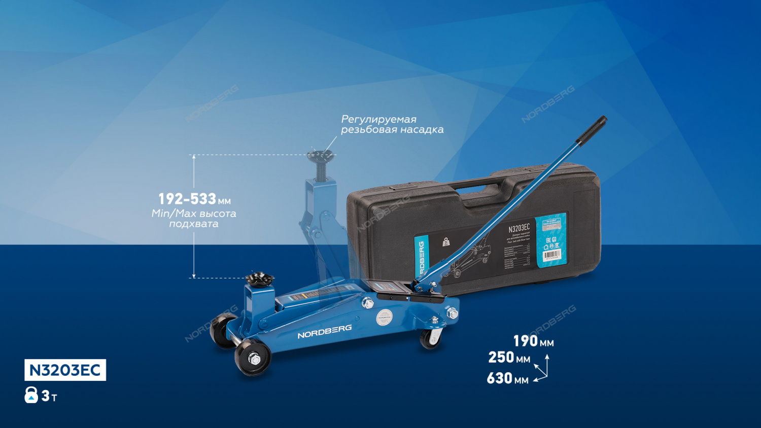 Домкрат подкатной для автолюбителя 3т в кейсе, Н=192-533мм NORDBERG N3203EC характеристики