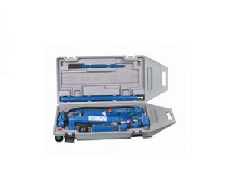 Набор аксессуаров для кузовного ремонта, включая гидроцилиндр и ручной насос.