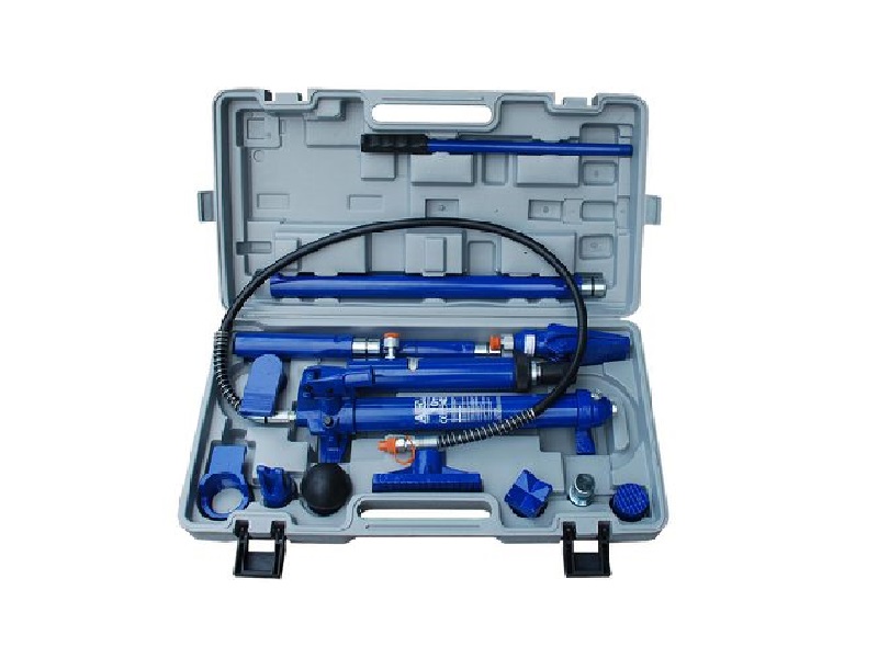 В комплект входят:насос гидравлический со шлангом, гидравлический цилиндр, удлинители, подставка, насадки.
