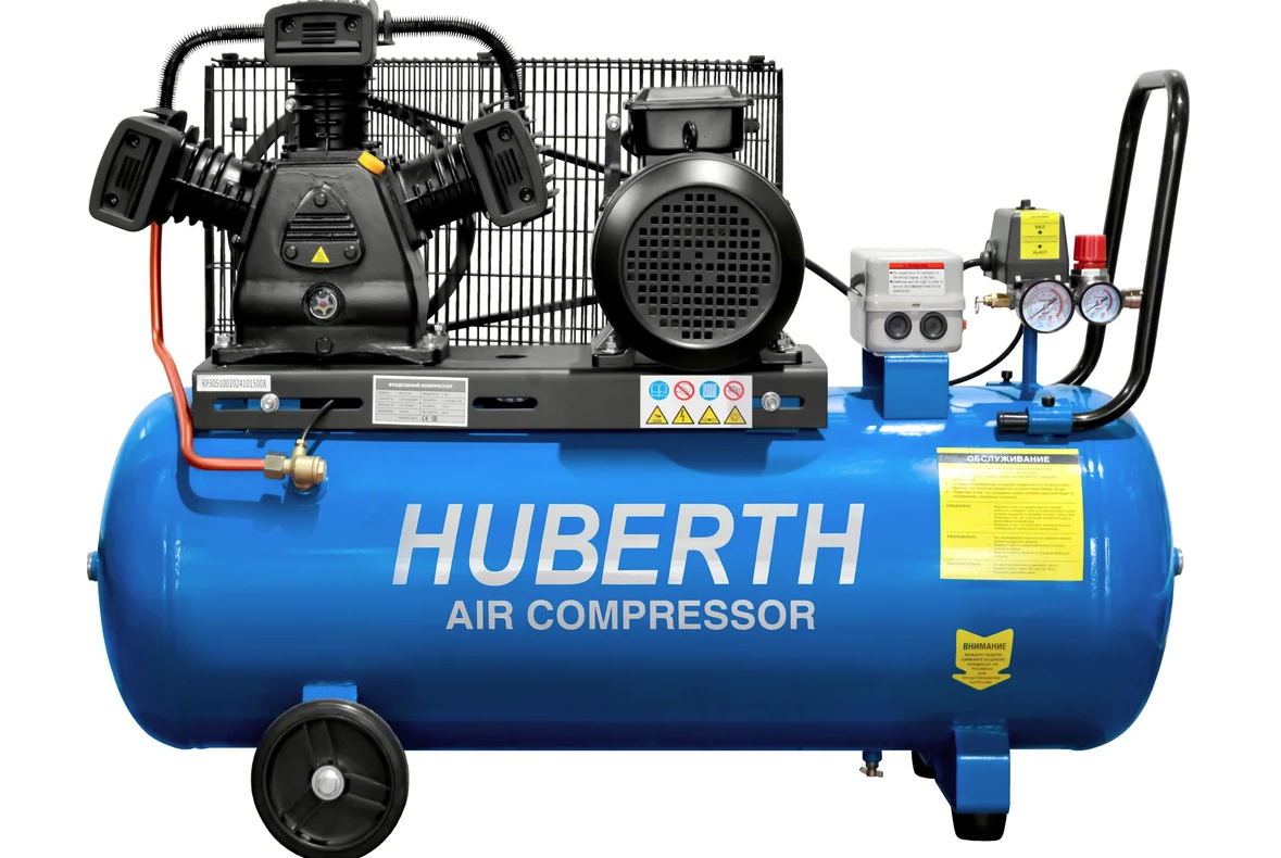 Поршневой воздушный компрессор Huberth с ремённым приводом оснащён 100-л ресивером горизонтального расположения и рассчитан на эксплуатацию на автостанциях, окрасочных и шиномонтажных мастерских, в промышленности и прочих сферах деятельности, где регулярно требуется применение сжатого воздуха.