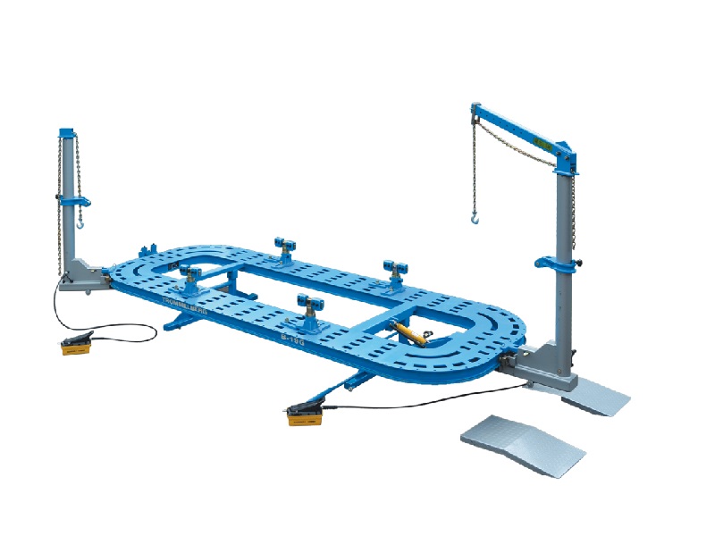 Платформенный стапель для восстановления геометрии кузова автомобилей, имеющих повреждения любой сложности.Платформа стапеля имеет продольные пазы, что позволяет устанавливать 4 кузовных зажима в любом месте платформы. Более того, наличие пазов позволяет полностью использовать поверхность платформы в процессе правки кузова.Кузовные зажимы стапеля обеспечивают простую и быструю фиксацию кузова ремонтируемого автомобиля на платформе. Зажим крепится одним болтом, и имеет регулировку по высоте.Две силовые стойки (башни) с гидравлическим приводом и тяговым усилием по 10 тонн свободно перемещаются вокруг платформы в пределах 360, что делает возможным приложение тягового усилия к любой точке кузова автомобиля. Высота приложения тягового усилия легко изменяется посредством изменения положения хомута со шкивом.Для удобного заезда и съезда автомобиля используется гидравлическое подъемное устройство для подъема/опускания платформы на одну сторону (односторонний подъемник). Управление подъемом и опусканием осуществляется посредством пневмогидравлического насоса. Кроме того, в комплект поставки стапеля входят две въездные аппарели.Помимо указанных особенностей стапель B 19G имеет широкое оснащение аксессуарами уже в стандартной комплектации: прочными цепями, зажимами, фиксаторами, соединителями и укоротителями цепи, комплектом для создания тягового усилия вниз и прочими аксессуарами.