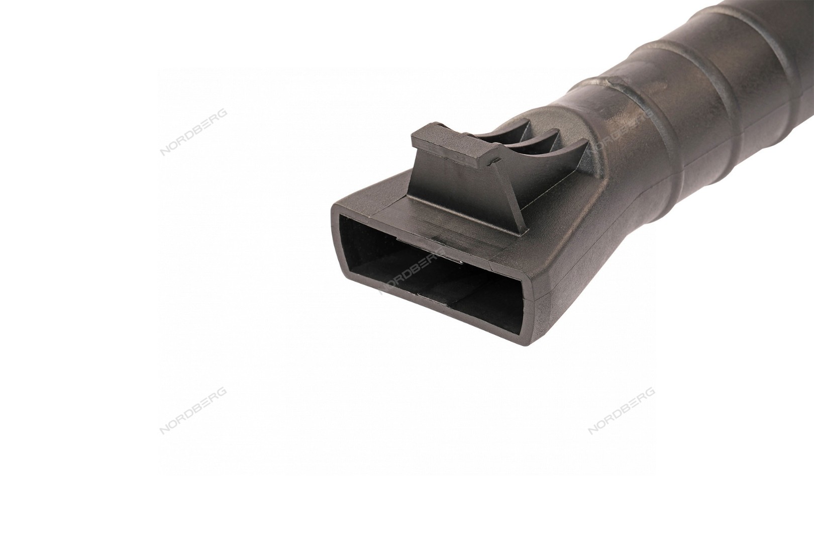 - Раструб для выпуска воздуха имеет специальную форму и упор, помогающие эффективно расположить его между ободом колеса и бортом шины. Раструб изготовлен из пластика, поэтому не повредит легкосплавный диск при соприкосновении с ним.