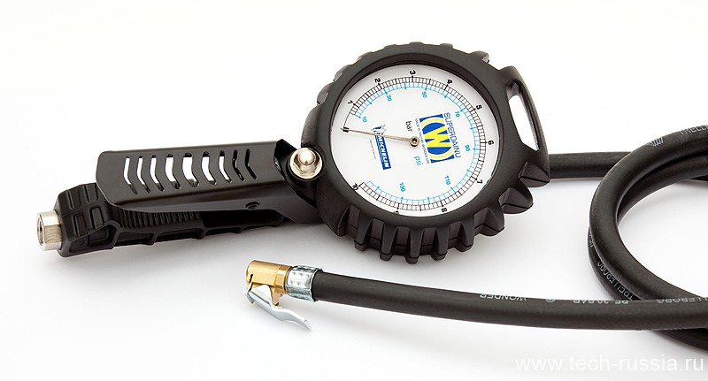 Для защиты корпуса манометра от ударов, он имеет резиновую окантовку с рёбрами жёсткости. Благодаря специальной конструкции манометр влагонепроницаем. При подключении через шланг к источнику сжатого воздуха пистолет для подкачки готов к работе. Облегченная рукоятка удобно размещается в руке. Сброс избыточного давления в колесе производится круглой кнопкой, расположенной на рукоятке пистолета. В корпусе пистолета имеется отверстие под крючок для крепления на стену.