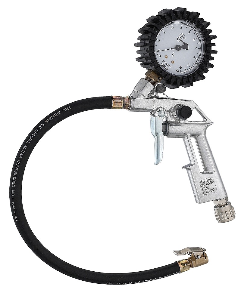 Пистолет для подкачки GUN6 оборудован профессиональным манометром WIKA с боковым расположением. Манометр WIKA тарирован, опломбирован и отличается высокой точностью показаний. Точность измерения 0,1 bar. Для защиты корпуса манометра от ударов, он имеет резиновую окантовку с ребрами жесткости. При подключении через шланг к источнику сжатого воздуха пистолет для подкачки готов к работе. Рукоятка, выполненная из алюминиевого сплава, удобно размещается в руке. Сброс избыточного давления в колесе производится круглой кнопкой, расположенной сбоку на рукоятке пистолета. В корпусе пистолета имеется отверстие под крючок для крепления на стену. Упакован в картонную коробку.