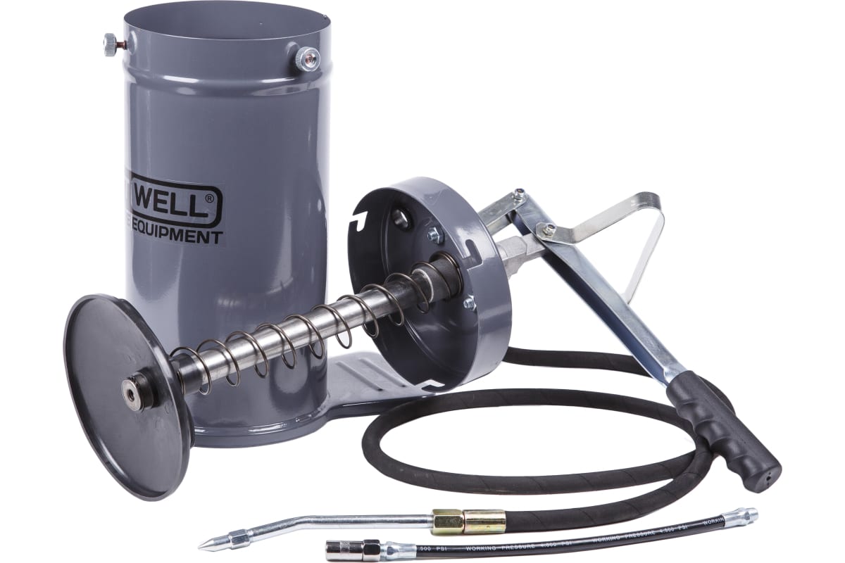 Нагнетатель солидола с ручным приводом KraftWell 5 л KRW1797B представляет из себя стальную емкость объемом 5 литров с рычагом, воздействуя на который создается давление, необходимое для нагнетания густой смазки. Благодаря небольшим габаритам и рукоятке в верхней части обеспечивается мобильность и удобство использования нагнетателя в удаленных от станции техобслуживания местах. Для этого его заранее заправляют необходимым количеством смазки.
