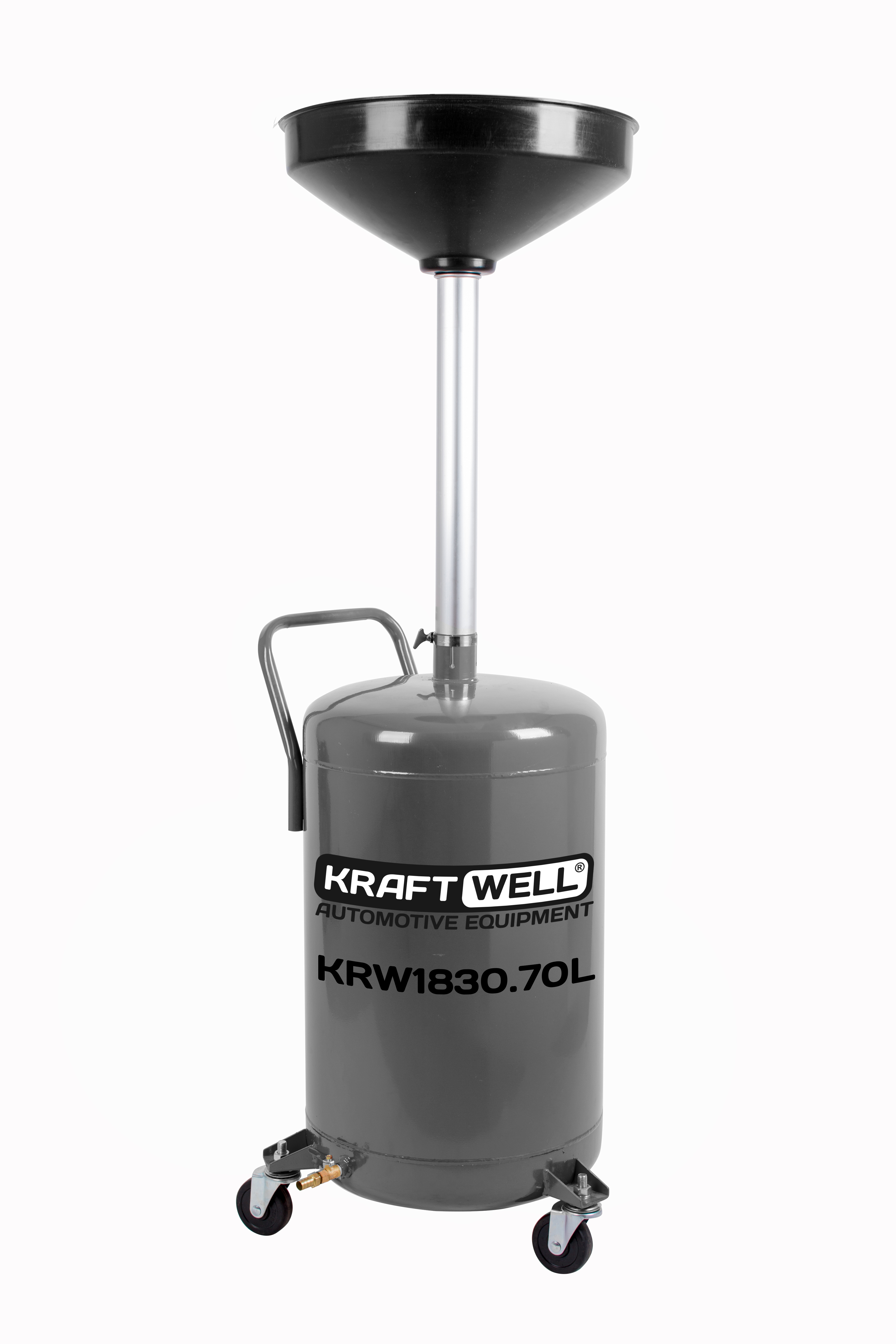 Установка KRAFTWELL, модель KRW1830.70L является упрощенной версией установки KRW1803.70L и предназначена для сбора масла, антифриза и других технических жидкостей методом слива самотеком. Основные отличия KRW1830.70L от KRW1803.70L заключаются в отсутствии шарового крана у основания приемной ванны, сливного шланга и системы слива жидкости из бака под давлением. При этом высота приемной ванны также регулируется, позволяя точно подобрать удобное положение при работе, а также защитить от разбрызгивания масла. Индикатор уровня жидкости в баке отсутствует. Для слива жидкости из установки необходимо подключить шланг для слива жидкости к штуцеру, расположенному в нижней части емкости. Шланг в комплект не входит!