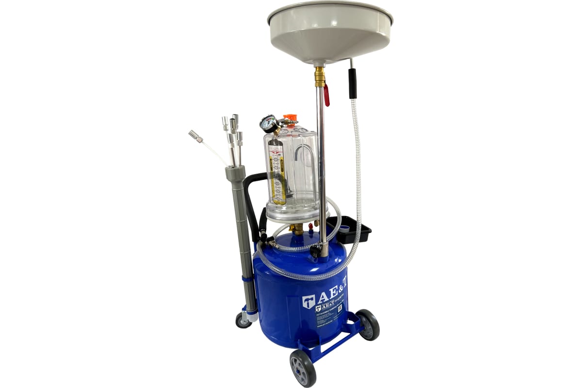Маслосборник AE&T TF-6238TPG предназначен для сбора отработанного масла, антифриза и других технических жидкостей (с температурой до 60°C) с двигателей, коробок передач и дифференциалов любых автомобилей самотеком и с помощью пневматической откачки. Процедура откачки технических жидкостей через щупы основана на принципе вакуумирования (Вентури-вакуумная вытяжная система), при котором создается разряжение и жидкость засасывается в емкость, и используется в тех случаях, когда слив невозможен. После создания вакуума в установке, она работает самостоятельно. Нет необходимости в постоянном подключении к сети сжатого воздуха. Установка для слива масла оснащена колесами и тем самым легко передвигается по рабочей зоне. Также маслосборника оснащен специальным гибким шлангом для слива отработанного масла из маслосборника.