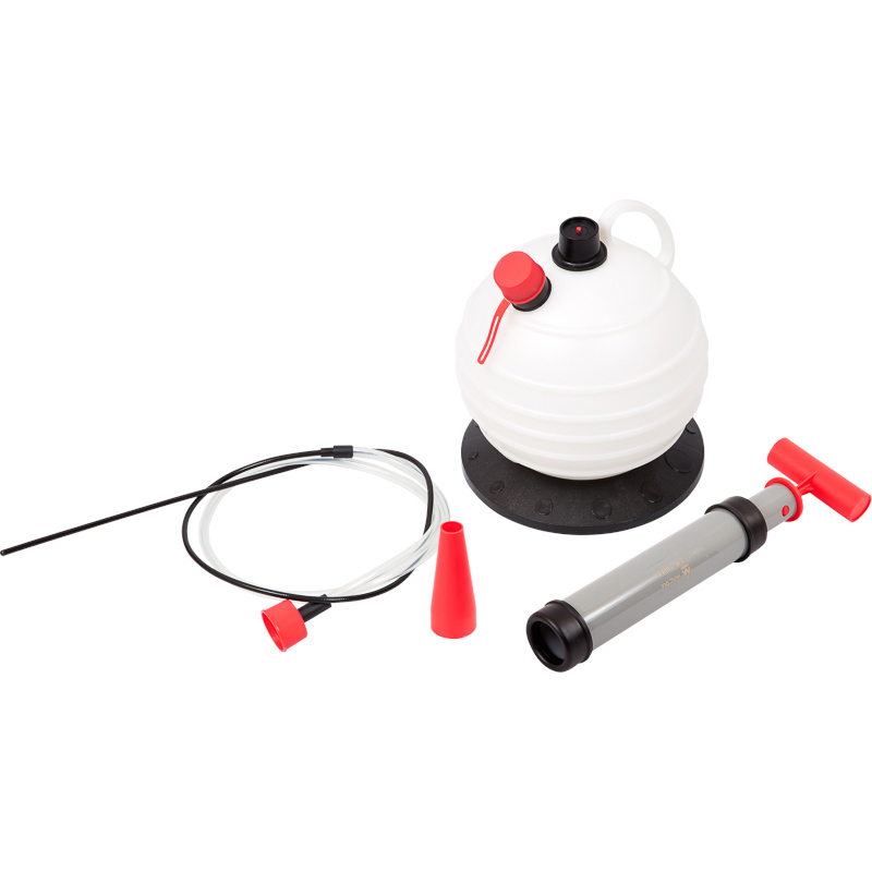 Детали устройства – бачок, вакуумный насос, носик и крышка сливного отверстия – изготовлены из прочного пластика, устойчивого к воздействию растворителей, заборный шланг состоит из двух частей: заборная часть с пружинно-витым металлическим тросиком и смотровая прозрачная часть из ПВХ. Ободок ниппеля, сливного отверстия и ободки вакуумного насоса для лучшего соединения покрыты резиновым уплотнителем – это позволяет избежать возможных утечек масла во время работы с устройством.