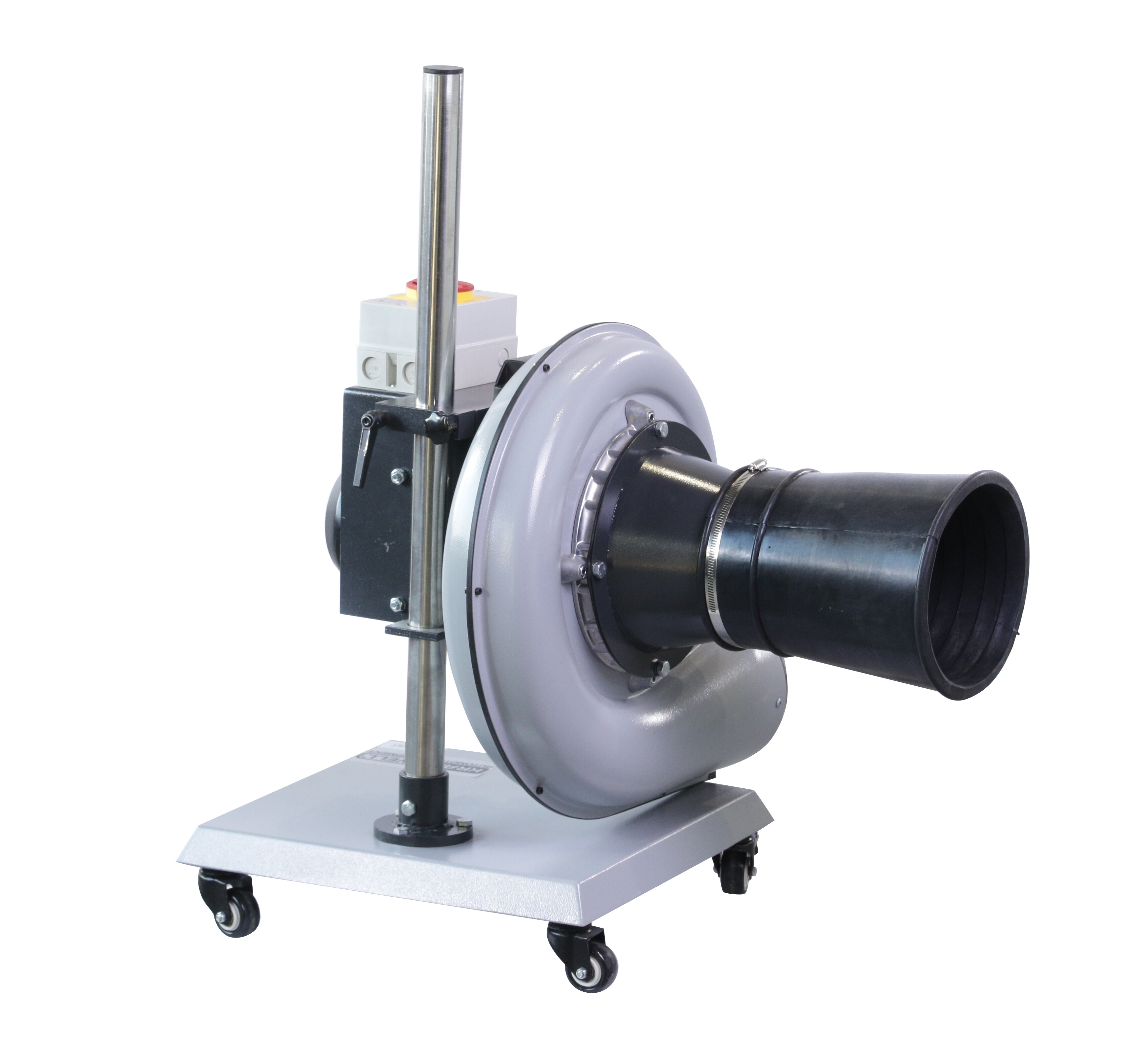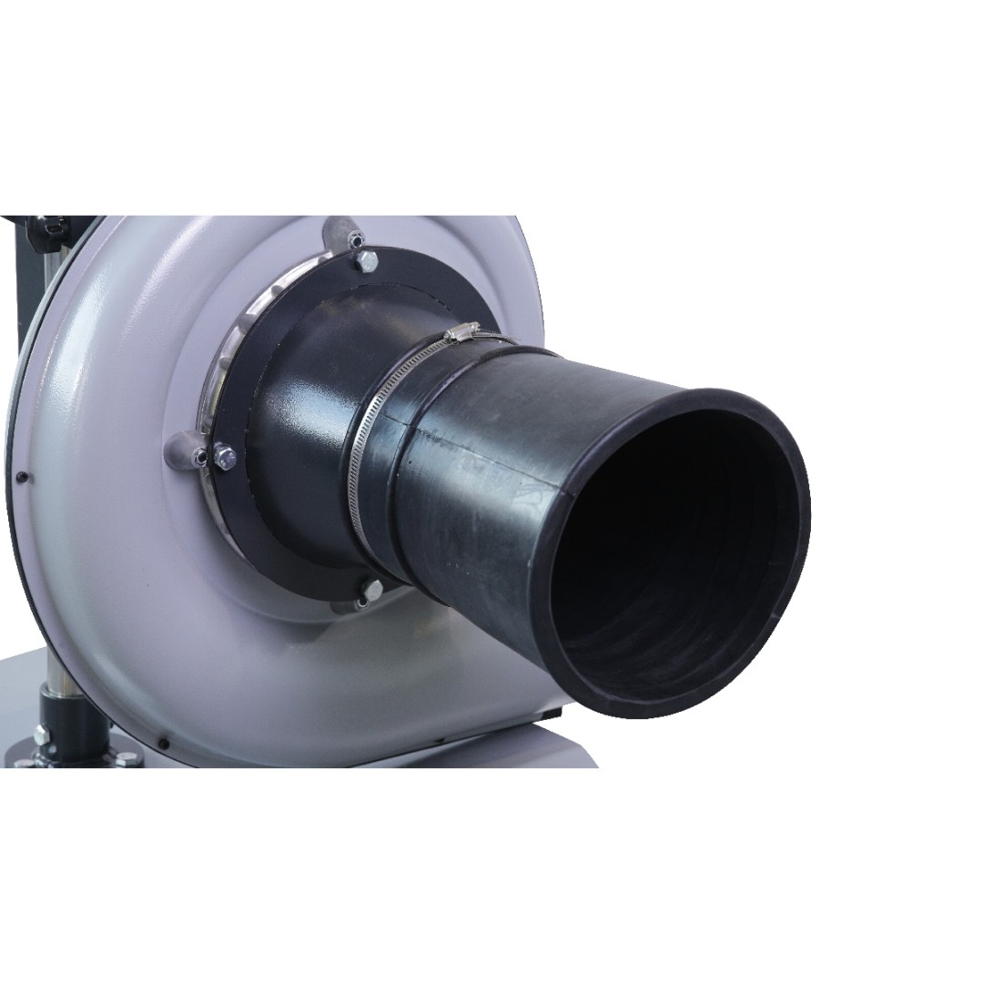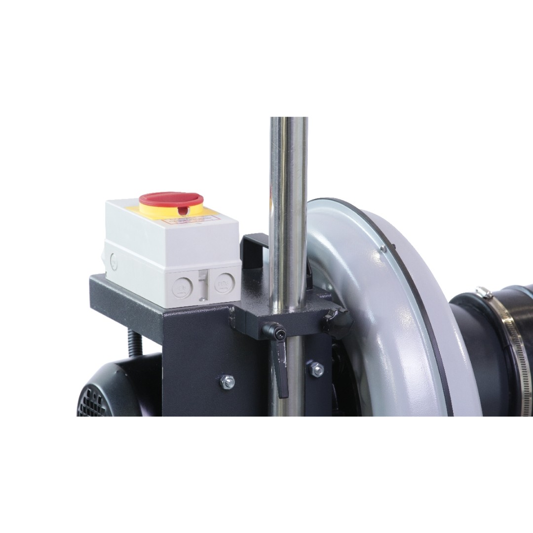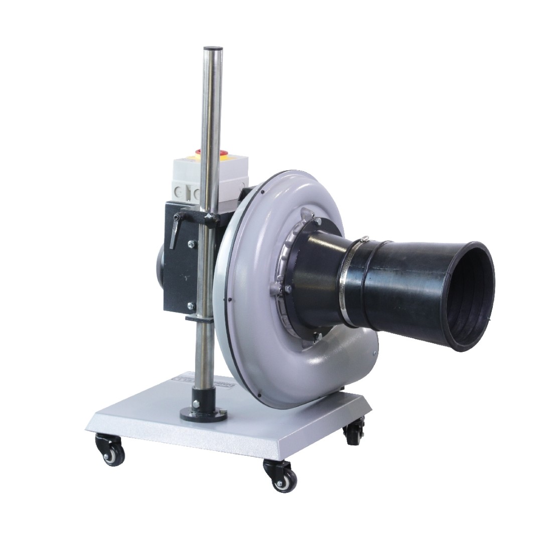 Принцип работы установки прост: вентилятор закреплен на вертикальной стойке при помощи фиксатора, позволяющего регулировать высоту подъема. Сама стойка крепится к платформе на 4-х колесах, позволяющих подкатить установку к автомобилю, а после окончания работ - вернуть к месту хранения. Входное отверстие вентилятора оснащено патрубком диаметром 250мм, через которы происходит забор выхлопных газов. К выпускному отверстию вентилятора возможно присоеднинить газоотводный шланг диаметром 127 мм любой длины.