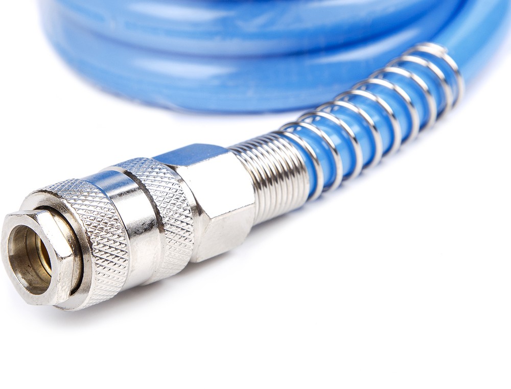 Полиуретановый спиральный шланг применяется для подачи воздуха от компрессора или линии сжатого воздуха к пневмоинструменту. За счет своей формы в виде спрали, шланг имеет достаточно компактный размер и не мешается под ногами. Как следствие - минимальный риск падения персонала. При этом, в растянутом виде шланг имеет длину 6 м, что позволяет комфортно работать с пневмоинструментом. С двух сторон шланг оснащен резьбовыми наконечниками для подключения быстросъемных соединений.