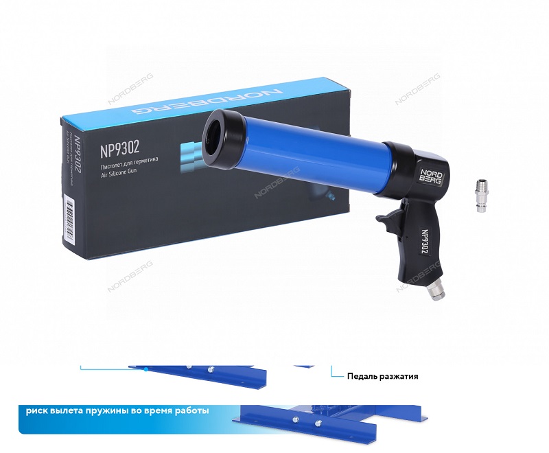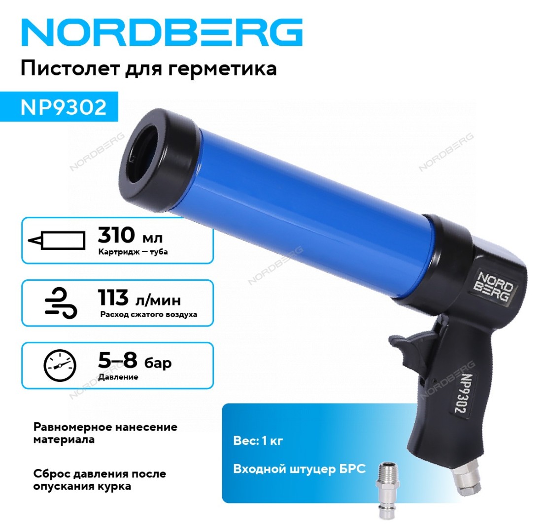 NORDBERG NP9302 — пневматический пистолет для герметика. Используется при кузовном ремонте автомобилей, вклейке стёкол, панелей, а также в строительных и ремонтных работах.