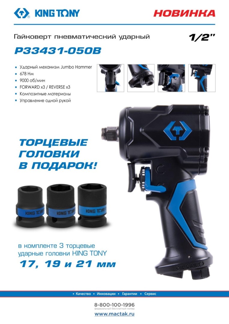 Гайковерт пневматический ударный 1/2", 678 нм, в комплекте 3 торцевые головки king tony p33431-050b характеристики