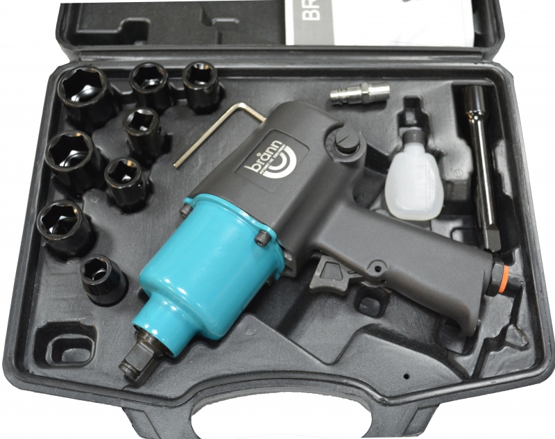 Ударный гайковерт 1/2”. Эргономичный курок и рукоятка. Гайковерт поставляется в кейсе с ударными головками (12, 13, 14, 15, 17, 19, 22, 24 мм). Хорошо подходит для автомобильных сервисов, шиномонтажных мастерских.