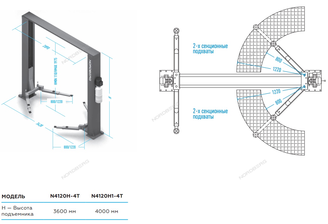 Электрогидравлический двухстоечный автоподъемник г/п 4т, H=4,0 м NORDBERG N4120H1-4B характеристики