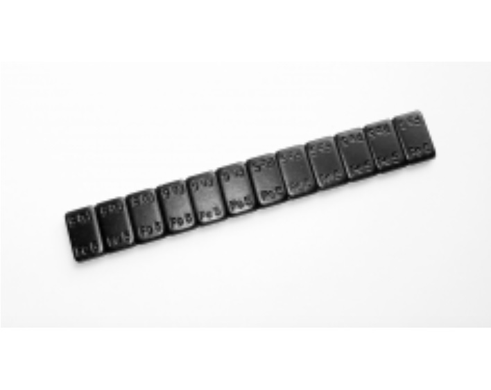 Чёрные стальные самоклеящиеся балансировочные грузики выпускаются в виде полосок массой 60 граммов (12 штук по 5 граммов).