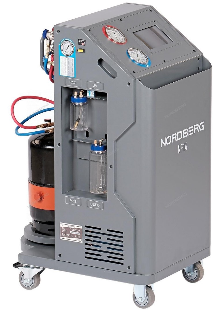 Автоматическая станция NORDBERG NF14 для заправки системы кондиционирования воздухом автомобилей представляет собой устройство по обслуживанию систем кондиционирования воздуха и выполняет следующие функции: