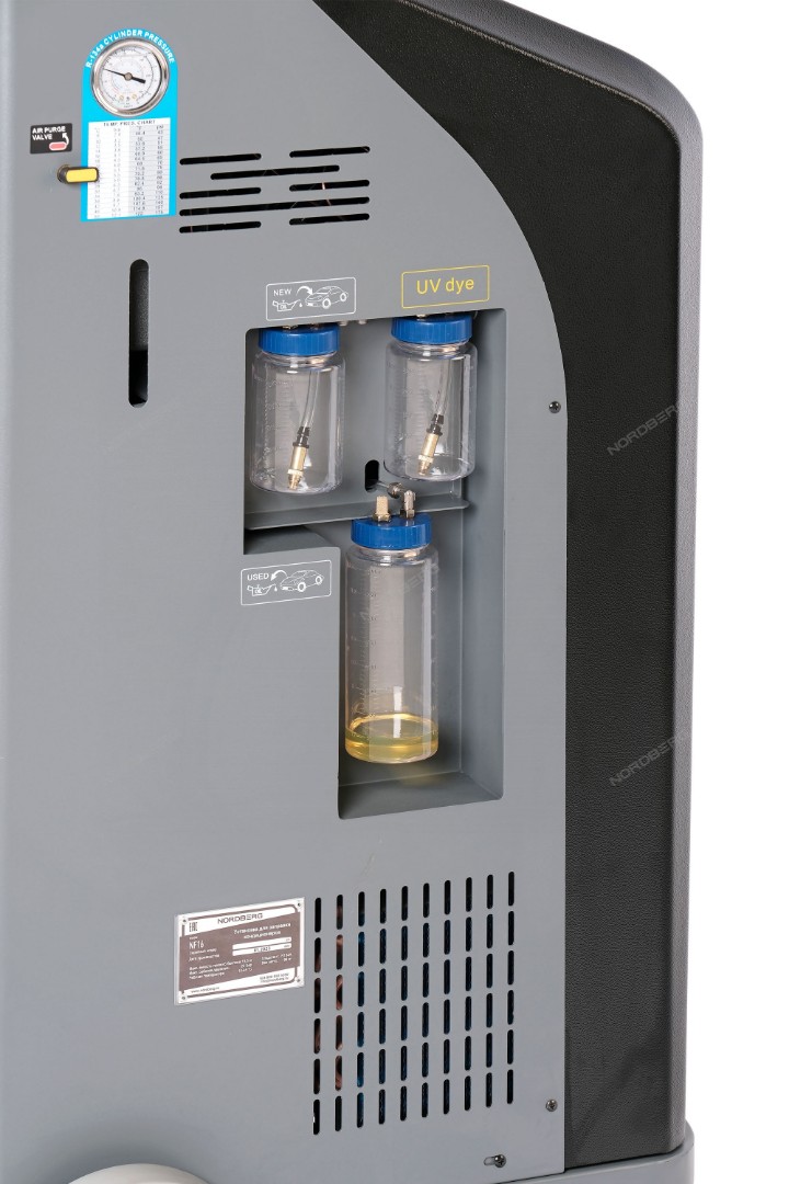 Автоматическая станция NORDBERG NF16 для заправки системы кондиционирования воздухом автомобилей представляет собой устройство по обслуживанию систем кондиционирования воздуха и выполняет следующие функции: