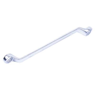 Ключ накидной слесарный изготовлен из хромованадиевой стали специального сплава, подвергнут дополнительным обработкам, в том числе финишному хромированию поверхности. Инструмент имеет две накидные части на концах, без утолщений. Они изогнуты под углом 75 градусов к плоскости рукоятки, что повышает эффективность и удобство при работе с крепежом. Внутренний 12-гранный профиль колец позволяет откручивать и закручивать болты и гайки с 6- и 12-гранными головками. Ключ отличается профессиональным качеством, выдерживает высокие нагрузки. Отвечают стандарту DIN 838.