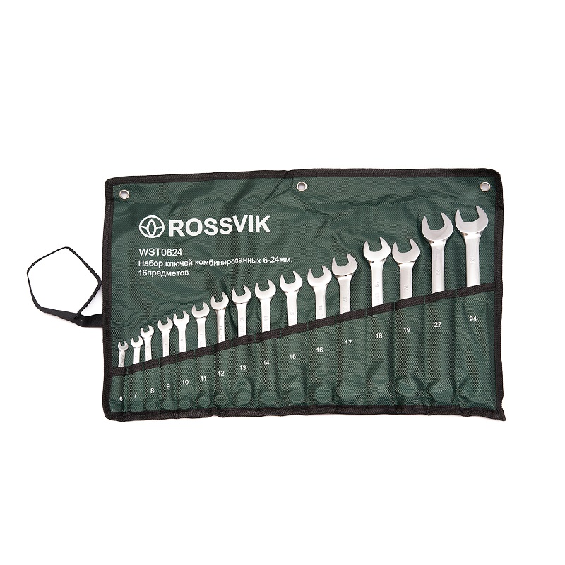Набор ключей комбинированных ROSSVIK 6-24мм, 16шт WST0624 один из самых распространенных типов инструмента, гаечный ключ представляет собой конструкцию, объединяющую две части -рожковую и накидную. Инструмент производится из стали высокой прочности. Покрытие ключа устойчиво к царапинам и прочим механическим воздействиям. Используется на станциях технического обслуживания, автомобильных мастерских, промышленности и в быту. Поставляется в удобном прочном чехле, где каждый ключ располагается в отдельном кармане, что позволяет удобно хранить и транспортировать набор.