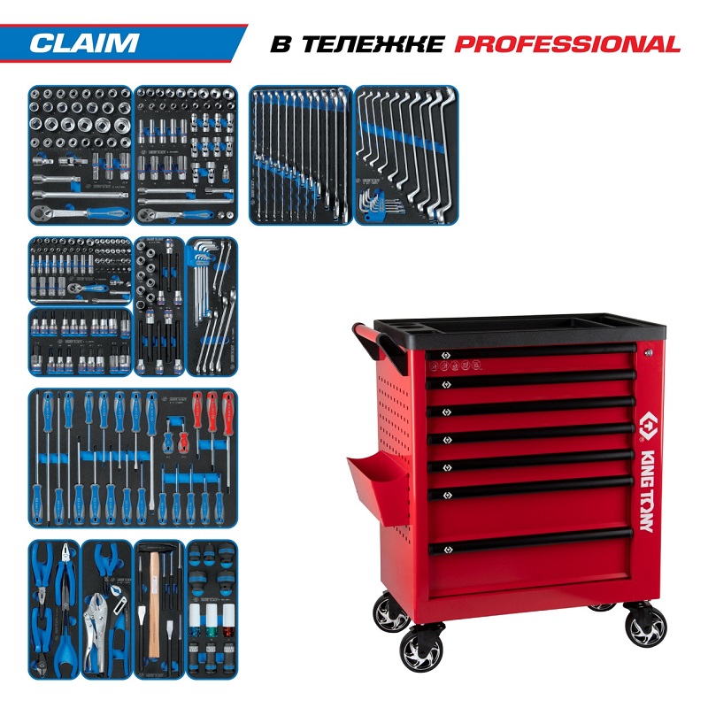 Набор инструментов 286 предметов, "claim", в красной тележке king tony 9g38-286mrvr характеристики