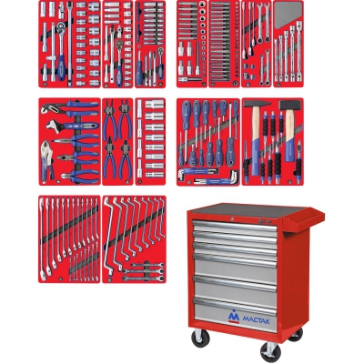 Набор инструментов торговой марки МАСТАК состоит из 270-и предметов, и включает в себя 14 ложементов. Предназначен для организации рабочего места в любом производственном помещении, станции технического обслуживания или авторемонтной мастерской. Набор размещается в тележке МАСТАК 521-06581R.