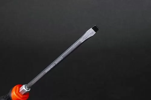 Отвертка изготовлена из высококачественной легированной хром-ванадиевой инструментальной стали, с последующей закалкой до твердости в пределах 46-48HRC, что соответствует всем требования нормативной документации. Наконечник проходит дополнительную термическую обработку с целью получения оптимального сочетания твердости и пластичности. Сквозная посадка стержня и металлический затыльник позволяют применять ударное воздействие. Шестигранный профиль у основания рукояти позволяет посредством ключа существенно увеличить усилие, передаваемое крепежу. Отвертка снабжена двухкомпонентной эргономичной рукоятью. Благодаря высококачественным компонентам рукоять имеют высокую стойкость к агрессивным средам.
