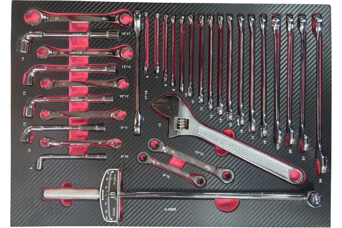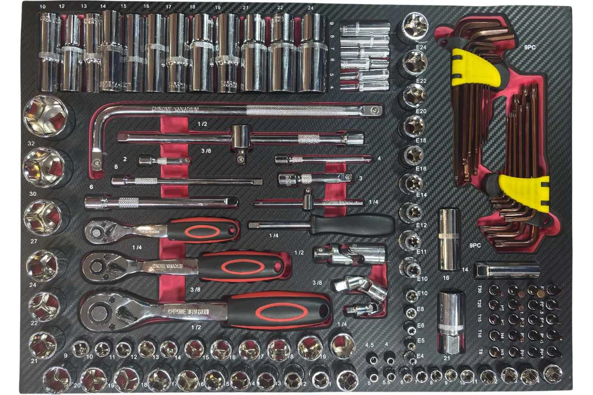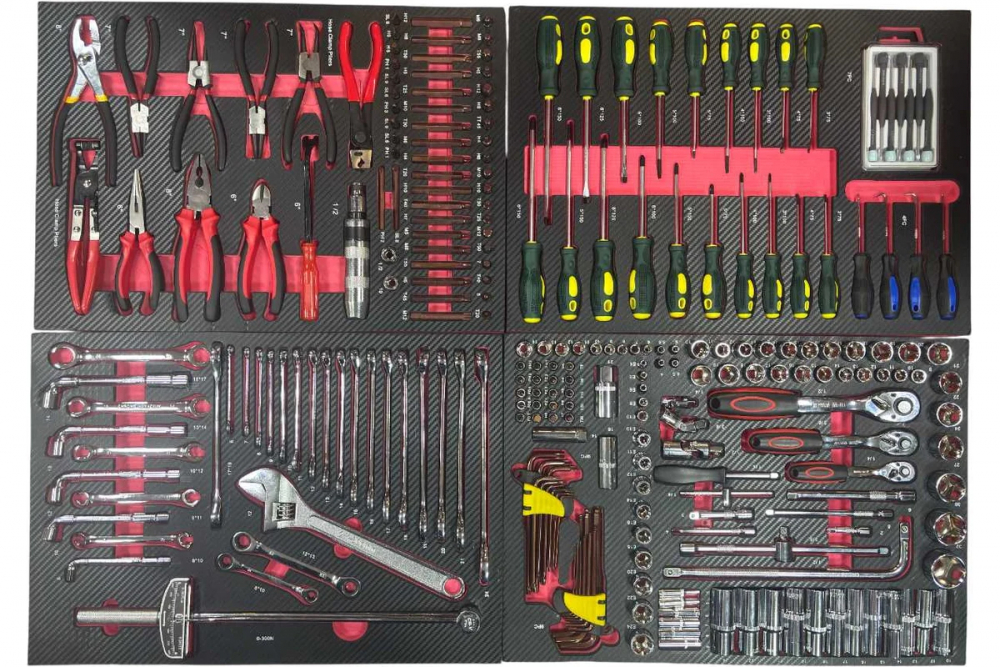 Набор поставляется в удобном ложементе, который может быть размещен в инструментальной тележке или использоваться как отдельное место хранения инструментов. 249 предметов.