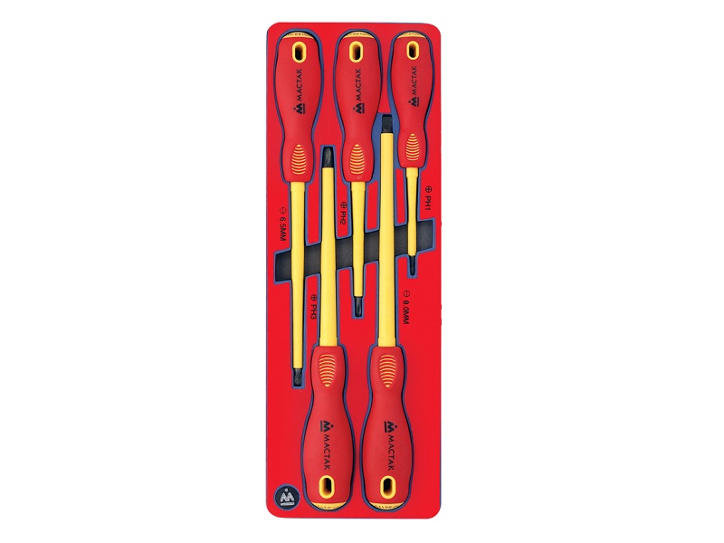 Набор инструментов 5 предметов отвертки диэлектрические Мастак 5-4005Е в ложементе из материала EVA предназначен для комплектации передвижных инструментальных тележек или слесарных верстаков при создании индивидуальных рабочих мест на станциях технического обслуживания автомобилей и других предприятиях, занимающихся обслуживанием и ремонтом различной техники.