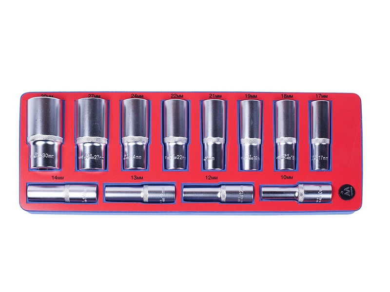 Набор инструментов 12 предметов глубокие торцевые головки с присоединительным квадратом 1/2 дюйма в ложементе из материала EVA предназначен для комплектации передвижных инструментальных тележек или слесарных верстаков при создании индивидуальных рабочих мест на станциях технического обслуживания автомобилей и других предприятиях, занимающихся обслуживанием и ремонтом различной техники.