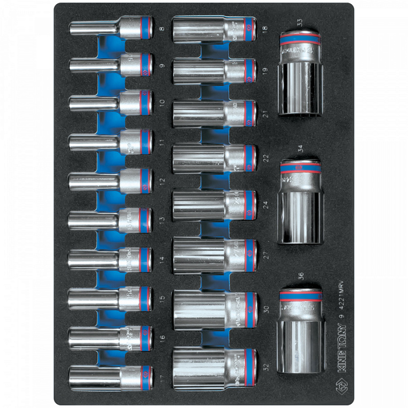 Набор глубоких торцевых головок 1/2, двен-е 8-36 мм, ложемент, 21 пр. KING TONY 9-4221MRV
