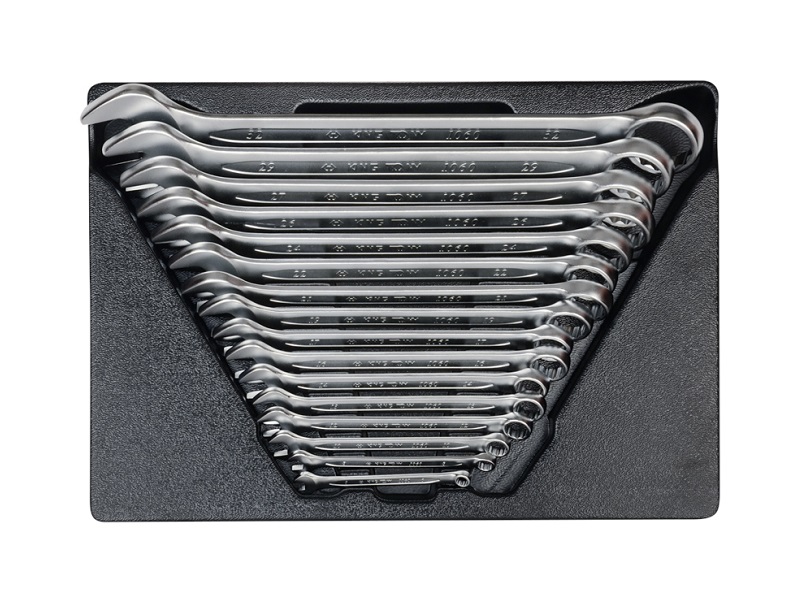 Набор комбинированных ключей KING TONY состоит из 16-ти предметов. Применение: монтаж и демонтаж крепёжных узлов различных изделий, устройств и агрегатов. Линейка размеров ключей, входящих в набор, включает в себя наиболее часто встречающиеся размеры. На ключи комбинированные KING TONY распространяется пожизненная гарантия, что даёт возможность применения их в профессиональных целях. Материал ложемента – ПВХ (поливинилхлорид). Изготовлен специально для комплектации инструментальной тележки.