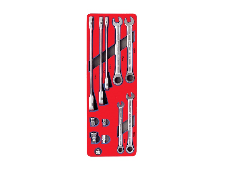Набор инструментов 11 предметов ключи комбинированные трещоточные рожково-накидные и адаптеры Мастак 5-21311 в ложементе из материала EVA предназначен для комплектации передвижных инструментальных тележек или слесарных верстаков при создании индивидуальных рабочих мест на станциях технического обслуживания автомобилей и других предприятиях, занимающихся обслуживанием и ремонтом различной техники.