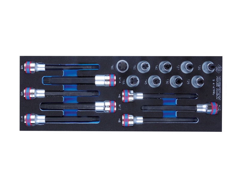 Набор торговой марки KING TONY включает в себя инструменты для работы с внутренним шестигранным профилем, а также профилем TORX и предназначен для монтажа и демонтажа крепёжных узлов различных изделий, устройств и агрегатов. Входящие в состав разрезные ключи предназначены для работ с гайками, расположенными на трубках, длинных шпильках и т.п. Специальный цепной съёмник предназначен для работ по монтажу и демонтажу масляных фильтров. Материал ложемента – EVA (ЭВА, этиленвинилацетат). При своей лёгкости, этот материал обладает высокими прочностными характеристиками, стойкостью к маслам и растворителям, при деформации возвращает прежнюю форму. Изготовлен специально для комплектации инструментальной тележки.