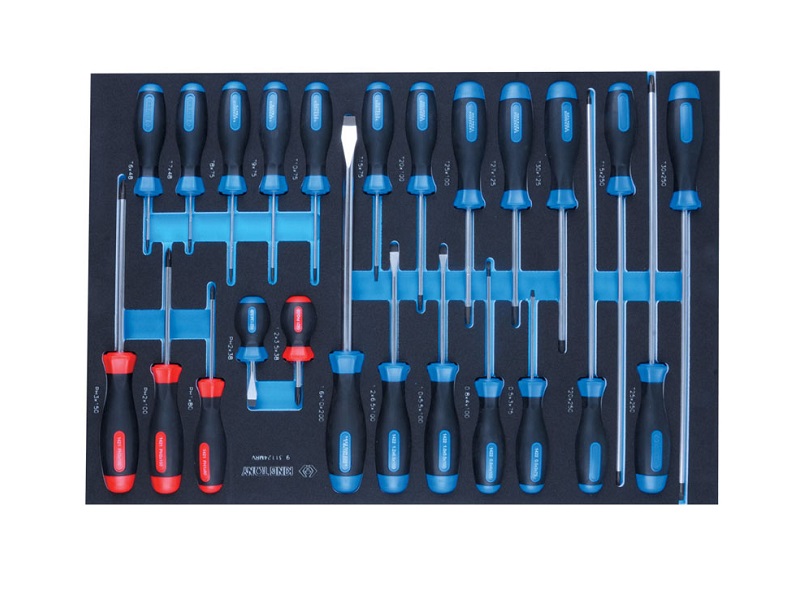 Набор отверток торговой марки KING TONY предназначен для монтажа и демонтажа крепёжных узлов различных изделий, устройств и агрегатов. Эргономичные ручки инструментов, изготовленные из двухкомпонентного материала – пластик + резина – удобны при удержании в процессе работы. Рабочие поверхности инструментов термически обработаны, что придаёт им особую прочность и стойкость к износу или сколам. Материал ложемента – EVA (ЭВА, этиленвинилацетат). При своей лёгкости, этот материал обладает высокими прочностными характеристиками, стойкостью к маслам и растворителям, при деформации возвращает прежнюю форму. Изготовлен специально для комплектации инструментальной тележки.