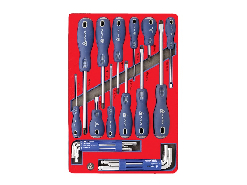 Набор инструментов 27 предметов отвертки, шестигранники и TORX Мастак 5-40627 в ложементе из материала EVA предназначен для комплектации передвижных инструментальных тележек или слесарных верстаков при создании индивидуальных рабочих мест на станциях технического обслуживания автомобилей и других предприятиях, занимающихся обслуживанием и ремонтом различной техники.