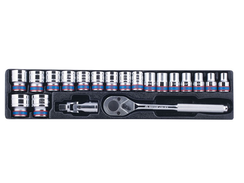 Набор с инструментом торговой марки KING TONY включает в себя торцевые головки и принадлежности, предназначен для монтажа и демонтажа крепёжных узлов различных изделий, устройств и агрегатов. Материал ложемента – ПВХ (поливинилхлорид). Набор предназначен для размещения в ящике инструментальном раскладном, МАСТАК 510-05420.