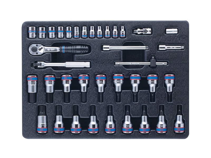 Набор с инструментом торговой марки KING TONY включает в себя торцевые головки и принадлежности, предназначен для монтажа и демонтажа крепёжных узлов различных изделий, устройств и агрегатов. Материал ложемента – ПВХ (поливинилхлорид). Изготовлен специально для комплектации инструментальной тележки.