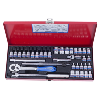 Набор профессионального слесарного ручного инструмента King Tony 3534MR с присоединительным квадратом 3/8 дюйма включает в себя 10 коротких шестигранных торцевых головок с рабочими размерами от 6 до 19 мм, 10 торцевых головок E-типа с рабочими размерами от E4 до E18, 10 торцевых головок со вставками 50 мм размерностью от T8 до T45, а также аксессуары (всё вместе – 34 предмета), размещённые в металлическом кейсе с габаритами 372x153x40 мм.