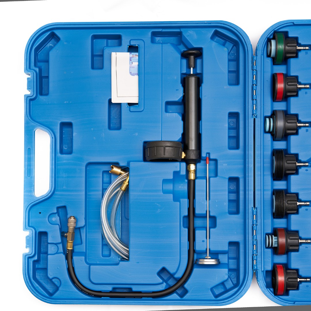 ST103 Набор инструментов для тестирования давления в радиаторе, 28 предметов - это простые в применении инструменты, эксплуатация которых не требует от пользователя каких-либо специальных знаний и умений. Основная рабочая функция - проверка системы охлаждения двигателя на предмет герметичности (по уровню давления). Комплект поставляется в эргономичном кейсе, оснащенном транспортировочной рукояткой, специальными замками-защелками (исключается вероятность открывания во время переноски), а также индивидуальной ячейкой под каждое из изделий, что облегчит хранение и выбор требуемого для работы приспособления.