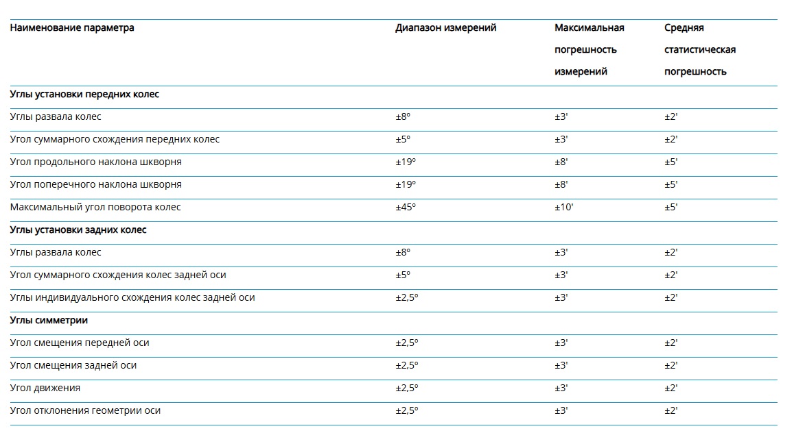 - Измерения максимального угла поворота колес без электронных поворотных кругов.