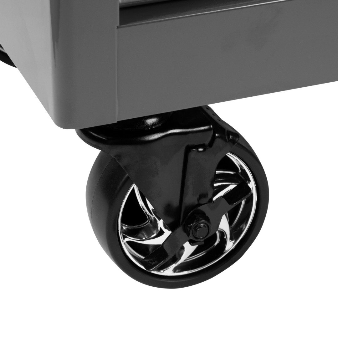 | Материал | Листовая сталь (корпус), вспененный PU (защитные коврики), алюминий (рукояти выдвижных ящиков), PVC (верхний органайзер), TPR+PP (колёса) |