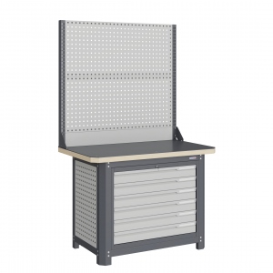 Экран (перфорированная панель) верстака выполнен с квадратной перфорацией 12х12 мм с шагом 38 мм для установки крючков, держателей и других аксессуаров. Экран крепятся к столешнице с помощью специальных кронштейнов. Максимальная масса груза, равномерно распределенного по поверхности экрана, составляет 71 кг.