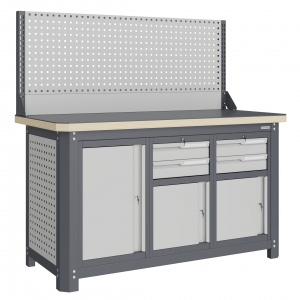 Экран (перфорированная панель) верстака выполнен с квадратной перфорацией 12х12 мм с шагом 38 мм для установки крючков, держателей и других аксессуаров. Экран крепятся к столешнице с помощью специальных кронштейнов. Максимальная масса груза, равномерно распределенного по поверхности экрана, составляет 71 кг.