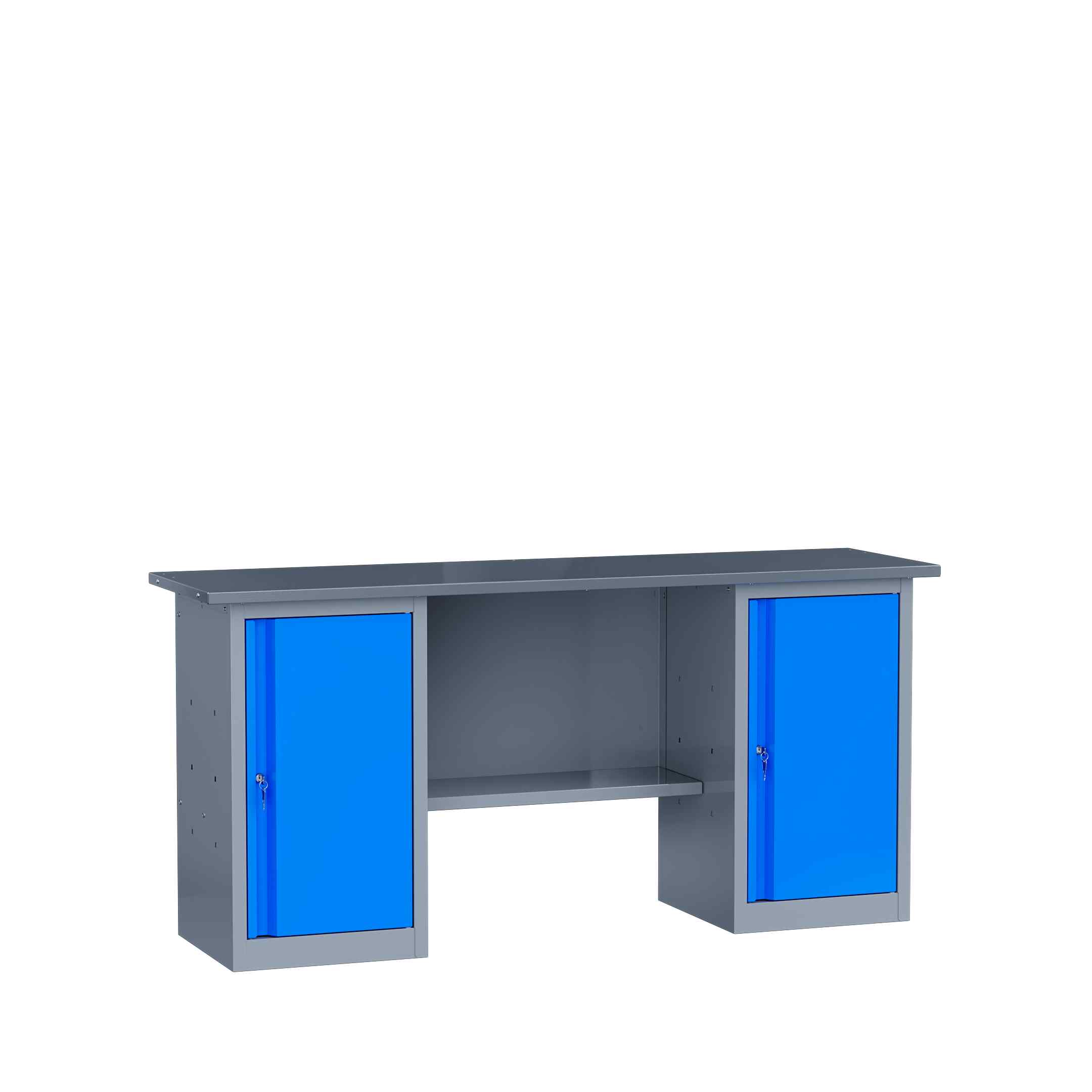Модель оснащена двумя объемными тумбами, которые разделены на две полки внутри. Каждая тумба имеет замок для надежного хранения инструментов. Между тумбами внизу располагается полка для складирования больших по размерам предметов.