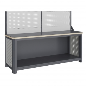 Экран (перфорированная панель) верстака выполнен с квадратной перфорацией 12х12 мм с шагом 38 мм для установки крючков, держателей и других аксессуаров. Экран крепятся к столешнице с помощью специальных кронштейнов. Максимальная масса груза, равномерно распределенного по поверхности экрана, составляет 71 кг.