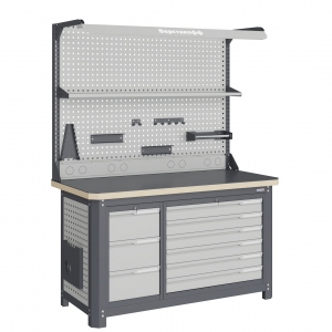 Экран (перфорированная панель) верстака выполнен с квадратной перфорацией 12х12 мм с шагом 38 мм для установки крючков, держателей и других аксессуаров. Экран крепятся к столешнице с помощью специальных кронштейнов. Максимальная масса груза, равномерно распределенного по поверхности экрана, составляет 71 кг.
